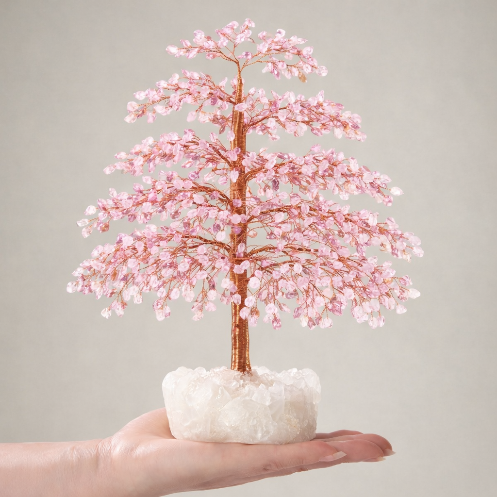 The leaves of the tree are made from natural Rose Quartz, a gemstone often associated with love, compassion, and emotional harmony. Rose Quartz is commonly believed to: